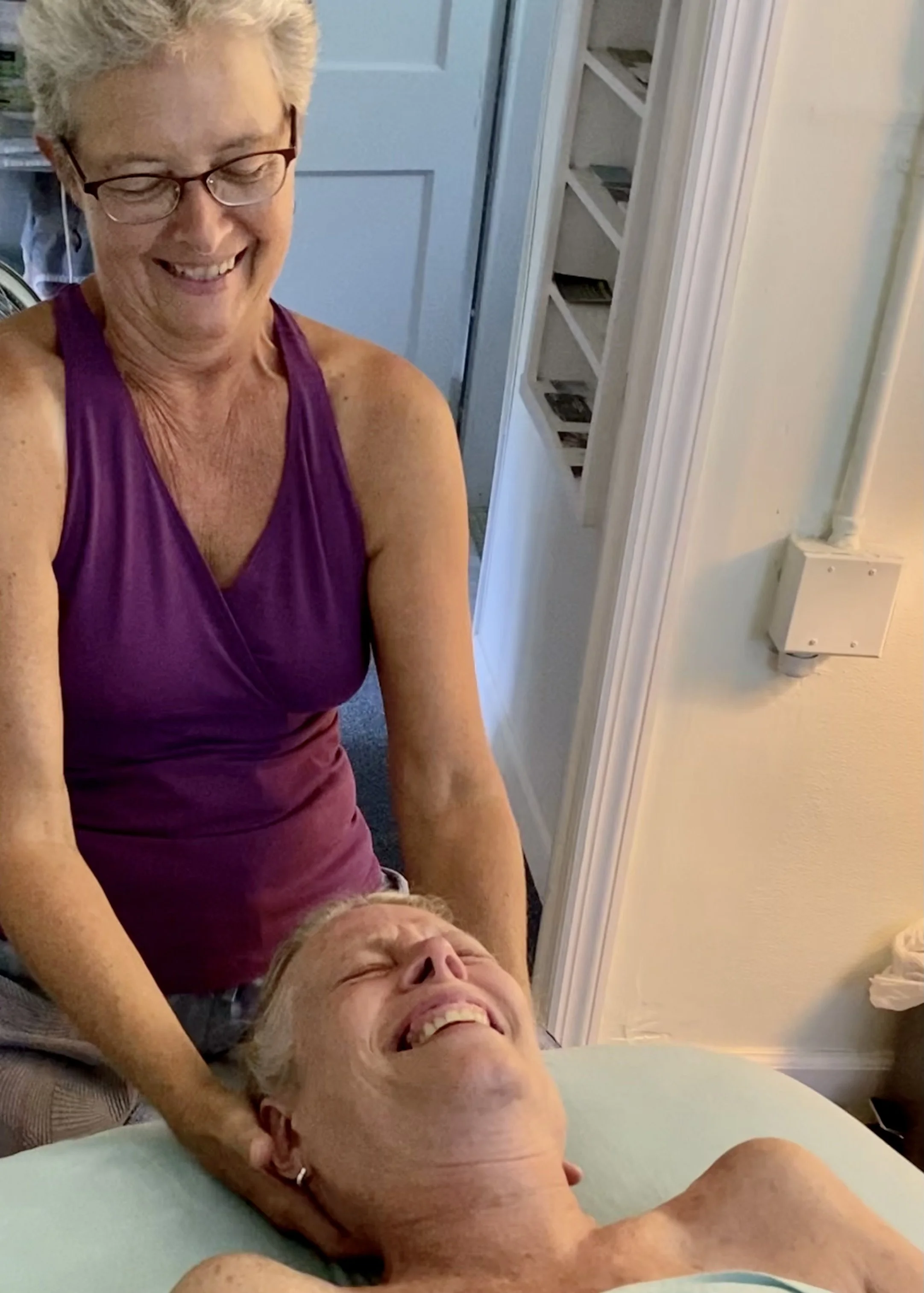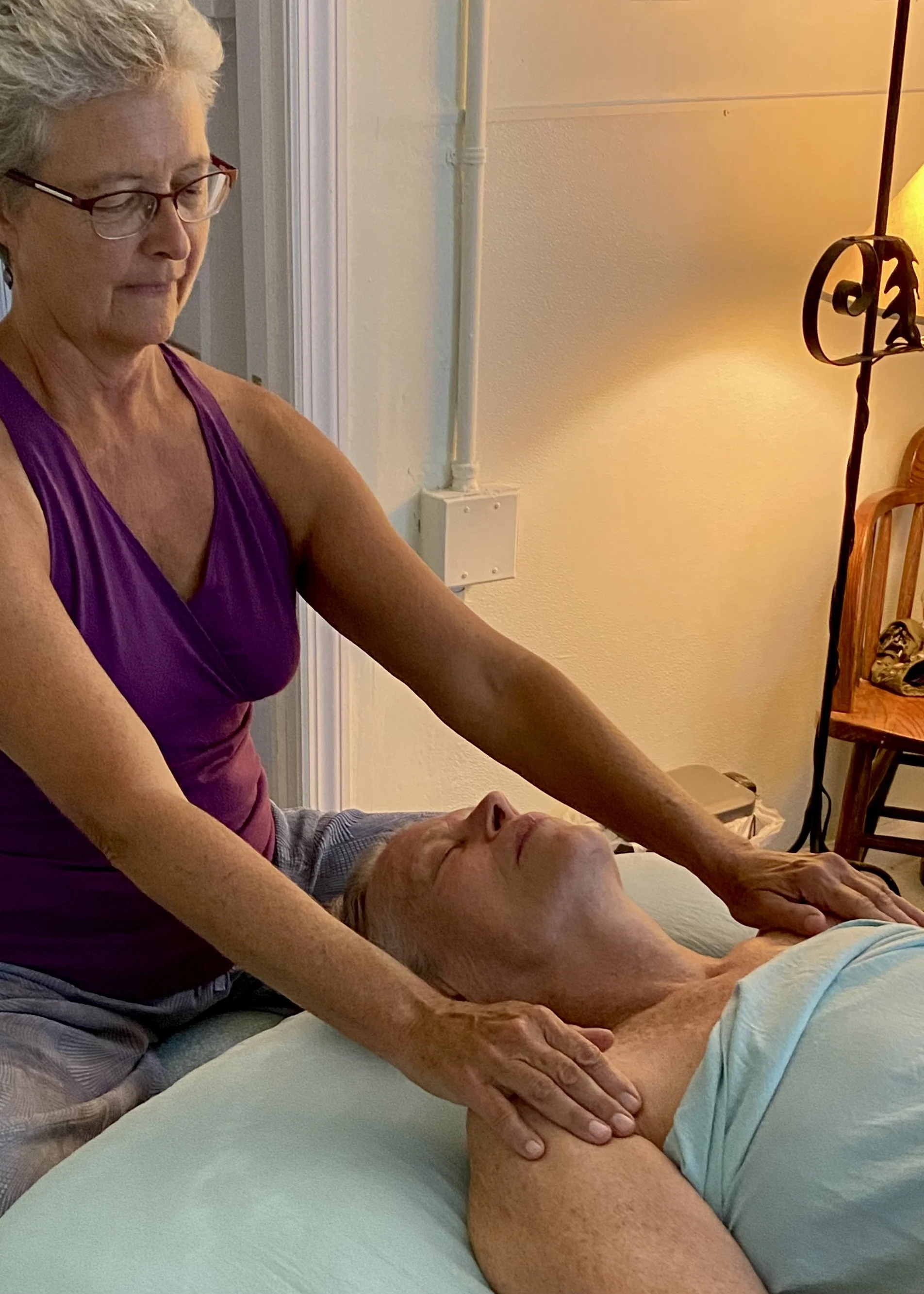 With a hand on her client's forehead and the other under her neck, Julie helps her center.